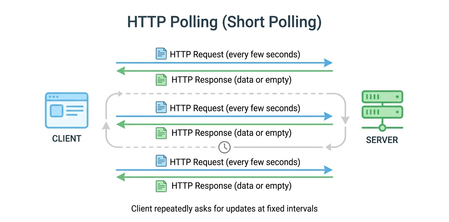 Traditional HTTP Polling, often referred to as 'Short Polling,' is the simplest way to simulate real-time updates. In this model, the client periodically sends an HTTP request to the server at a fixed interval (e.g., every 5 or 10 seconds) to check if there is any new data available. The server immediately responds with the data if it exists, or an empty response if nothing has changed since the last request.